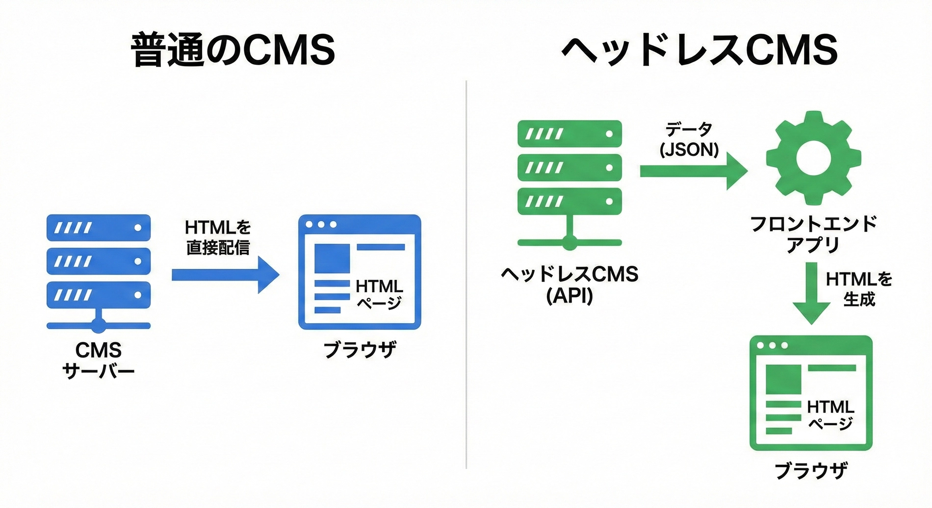 最大の差異は、「フロントエンド(見た目)」と「バックエンド(データ)」が完全に分離(デカップリング)されていることにあります。
